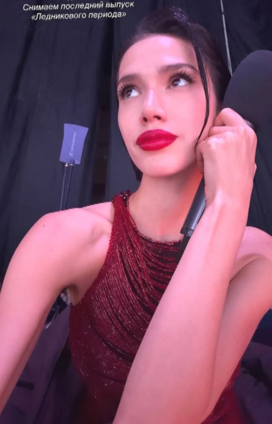 23-летняя олимпийская чемпионка предстала в облегающем бордовом платье без рукавов, декорированном сверкающим бисером. Ей сделали макияж с подкрученными ресницами, персиковыми румянами и ярко-красной помадой для губ. Волосы девушки собрали в элегантную прическу. «Третий день. Снимаем последний выпуск «Ледникового периода»»,- рассказала Алина.