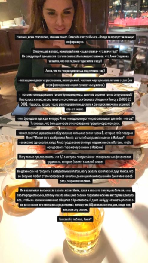 На следующий день после трагедии единственное, что сказала Анна Седокова, — что последние годы жила в аду! Анна, что ты подразумеваешь под словом «ад»? Посещение дорогих ресторанов, мероприятий, частные чартерные полеты на отдых? Возможно, поддержание твоего бренда одежды, выплата зарплаты твоим сотрудникам? Насколько я знаю, месяц твоего несостоявшегося бизнеса обходился Янису в $15 000–20 000. Надеюсь, вскоре после расследования и доступа к банковским счетам всем все станет ясно. Какой у тебя ад, Анна?