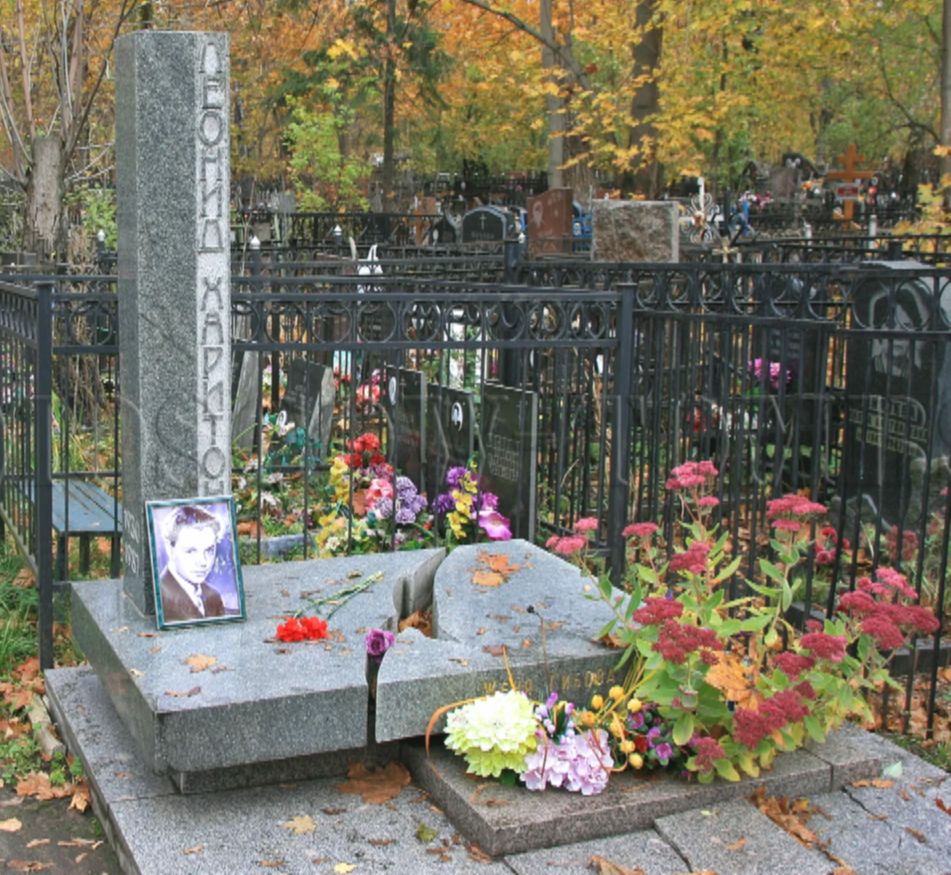 На могиле Леонида Харитонова вскоре установили памятник — мраморную плиту, надвое расколотую глубокой трещиной. Линия этого разлома неровная, и она в точности повторяет силуэт знаменитой мхатовской чайки.