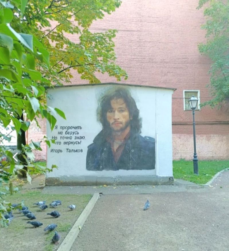 Это граффити, посвященное памяти музыканта. Этот своеобразный памятник может увидеть каждый, кто свернет с Литейного в старый дворик близ сквера, в котором расположен памятник Н.А. Некрасову. С самого проспекта увидеть граффити невозможно, придется свернуть в дворик, чтобы его увидеть.